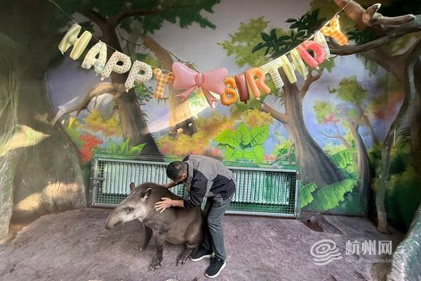 A young South American tapir at Hangzhou Safari Park marked her first birthday this week with a pink-themed celebration that delighted visitors.