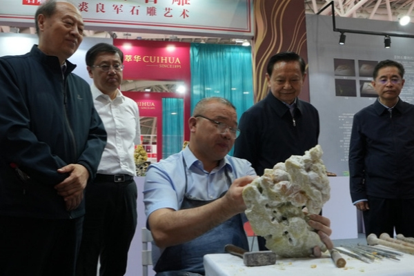 Attendees appreciate the exquisite craftsmanship of stone carvings at the expo. [Photo/Tide News]