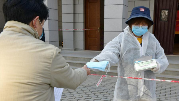 A community worker dispenses protective materials to local residents at Tanhualin community in Wuchang District in Wuhan, central China's Hubei Province, Feb. 9, 2020. (Xinhua/Li He)