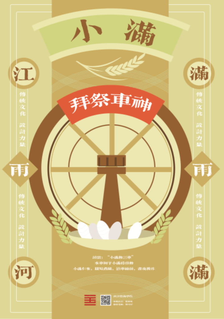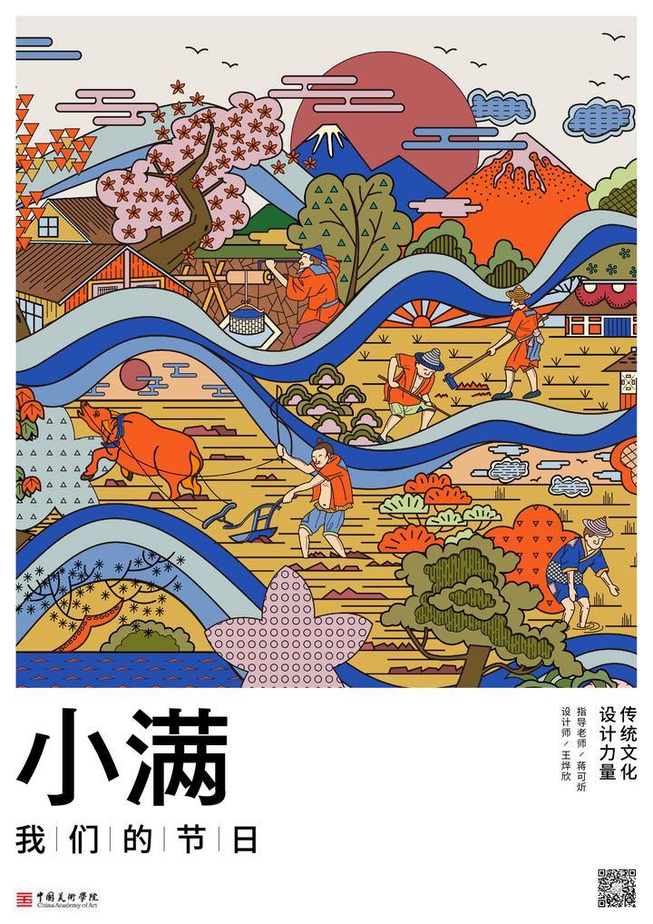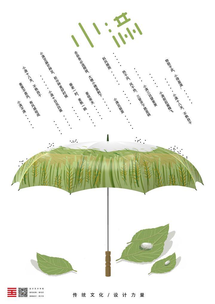 Introduction: Grain buds is the beginning of the rainy season. Abstract elements are used to show the characteristics of Grain buds: the pattern of rain at the bottom right indicates heavy rainfall, wave elements represent streams and rivers, water wheel at the top, and the grass at the bottom left show vitality of Grain buds. The fluorescent green hue stands for the hope of the season.