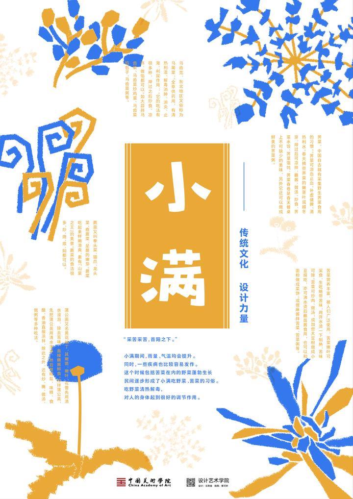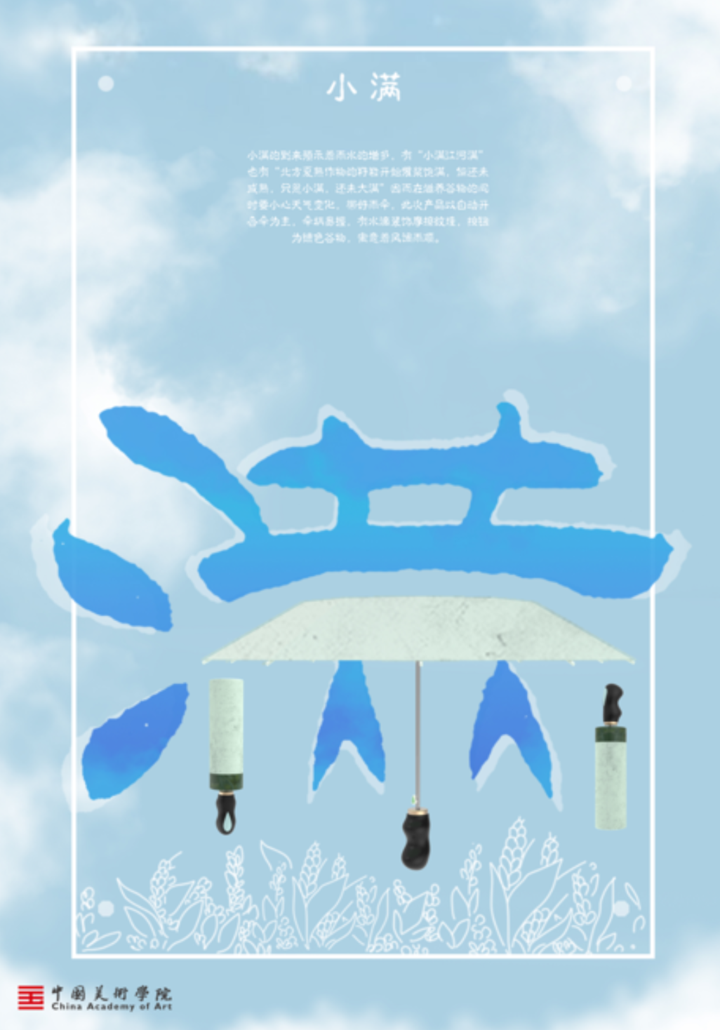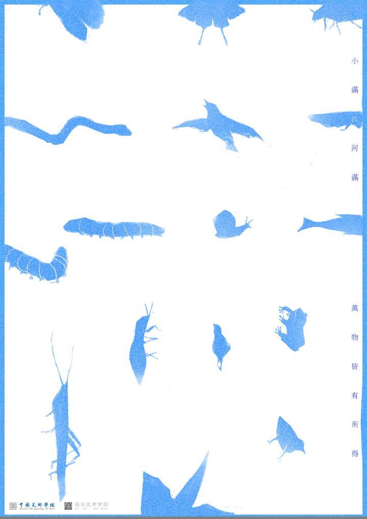 Introduction: The poster depicts the most active creatures in Grain buds. Meanwhile they are formed into a white character of “满” in Chinese, which stands for Grain buds. The color blue is to praise the power of life and yearn for the rain.
