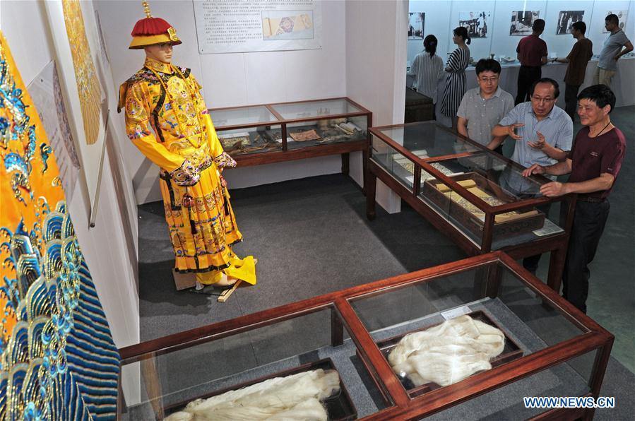 Wang Yishi arranges silk items at his Jili silk museum in Huzhou City, east China's Zhejiang Province, June 11, 2020. Jili silk, produced in Jili Village of Huzhou, is famous for its high quality. It was designated as the material to make ropes for Chinese emperors since the middle of the Ming Dynasty (1368-1644). In 2011, the making technique of silk was listed as one of the national intangible cultural heritages. It is known worldwide since 1851 when Jili silk won the first gold prize for China during the World Expo. Wang Yishi, 63 years old, a farmer at the Jili Village, has been working on inheriting the making skills of Jili silk for many years. He takes care of his silkworm farm every day and also runs a museum for the craft. The museum was opened to the public for free in July of 2018, with 300 plus silk-related items on display. (Xinhua/Tan Jin)