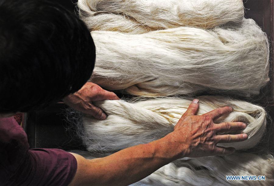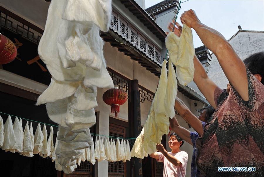Wang Yishi (L Back) and his wife Ji Jinmei (R Back) dry silk materials for making silk quilt at his Jili silk museum in Huzhou City, east China's Zhejiang Province, June 12, 2020. Jili silk, produced in Jili Village of Huzhou, is famous for its high quality. It was designated as the material to make ropes for Chinese emperors since the middle of the Ming Dynasty (1368-1644). In 2011, the making technique of silk was listed as one of the national intangible cultural heritages. It is known worldwide since 1851 when Jili silk won the first gold prize for China during the World Expo. Wang Yishi, 63 years old, a farmer at the Jili Village, has been working on inheriting the making skills of Jili silk for many years. He takes care of his silkworm farm every day and also runs a museum for the craft. The museum was opened to the public for free in July of 2018, with 300 plus silk-related items on display. (Xinhua/Tan Jin)