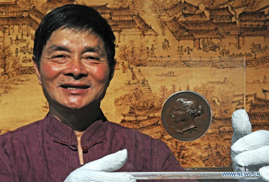 Wang Yishi shows the gold prize won by Jili silk during the World Expo in 1851 at his Jili silk museum in Huzhou City, east China's Zhejiang Province, June 11, 2020. Jili silk, produced in Jili Village of Huzhou, is famous for its high quality. It was designated as the material to make ropes for Chinese emperors since the middle of the Ming Dynasty (1368-1644). In 2011, the making technique of silk was listed as one of the national intangible cultural heritages. It is known worldwide since 1851 when Jili silk won the first gold prize for China during the World Expo. Wang Yishi, 63 years old, a farmer at the Jili Village, has been working on inheriting the making skills of Jili silk for many years. He takes care of his silkworm farm every day and also runs a museum for the craft. The museum was opened to the public for free in July of 2018, with 300 plus silk-related items on display. (Xinhua/Tan Jin)