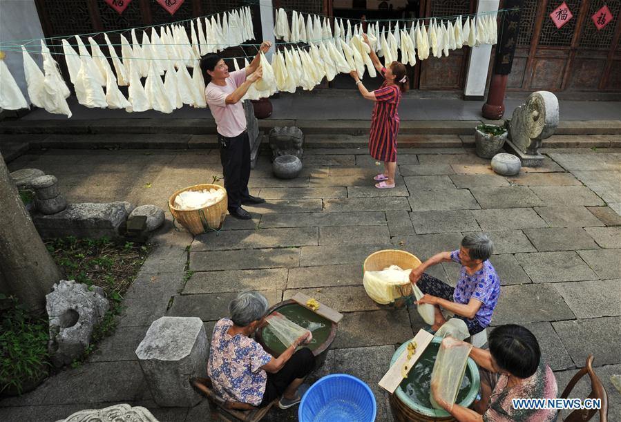 Wang Yishi (1st L) and villagers dry silk materials for making silk quilt at his Jili silk museum in Huzhou City, east China's Zhejiang Province, June 12, 2020. Jili silk, produced in Jili Village of Huzhou, is famous for its high quality. It was designated as the material to make ropes for Chinese emperors since the middle of the Ming Dynasty (1368-1644). In 2011, the making technique of silk was listed as one of the national intangible cultural heritages. It is known worldwide since 1851 when Jili silk won the first gold prize for China during the World Expo. Wang Yishi, 63 years old, a farmer at the Jili Village, has been working on inheriting the making skills of Jili silk for many years. He takes care of his silkworm farm every day and also runs a museum for the craft. The museum was opened to the public for free in July of 2018, with 300 plus silk-related items on display. (Xinhua/Tan Jin)