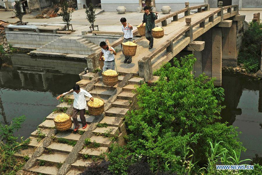 Wang Yishi (1st R) and villagers carry harvested silkworm cocoons to be sold in Jili Village of Huzhou City, east China's Zhejiang Province, June 3, 2011. Jili silk, produced in Jili Village of Huzhou, is famous for its high quality. It was designated as the material to make ropes for Chinese emperors since the middle of the Ming Dynasty (1368-1644). In 2011, the making technique of silk was listed as one of the national intangible cultural heritages. It is known worldwide since 1851 when Jili silk won the first gold prize for China during the World Expo. Wang Yishi, 63 years old, a farmer at the Jili Village, has been working on inheriting the making skills of Jili silk for many years. He takes care of his silkworm farm every day and also runs a museum for the craft. The museum was opened to the public for free in July of 2018, with 300 plus silk-related items on display. (Xinhua/Tan Jin)