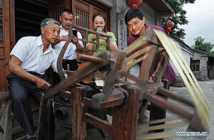 Wang Yishi (1st R) observes the silk-making technique of inheritor Gu Mingqi (1st L) at his Jili silk museum in Huzhou City, east China's Zhejiang Province, June 11, 2020. Jili silk, produced in Jili Village of Huzhou, is famous for its high quality. It was designated as the material to make ropes for Chinese emperors since the middle of the Ming Dynasty (1368-1644). In 2011, the making technique of silk was listed as one of the national intangible cultural heritages. It is known worldwide since 1851 when Jili silk won the first gold prize for China during the World Expo. Wang Yishi, 63 years old, a farmer at the Jili Village, has been working on inheriting the making skills of Jili silk for many years. He takes care of his silkworm farm every day and also runs a museum for the craft. The museum was opened to the public for free in July of 2018, with 300 plus silk-related items on display. (Xinhua/Tan Jin)
