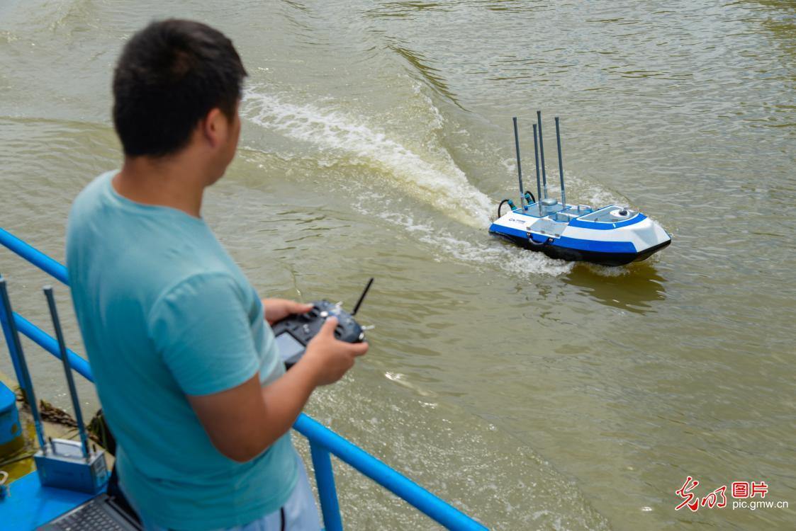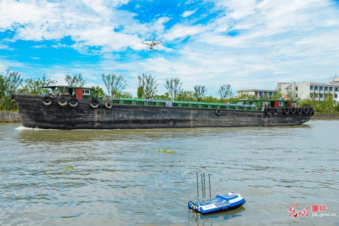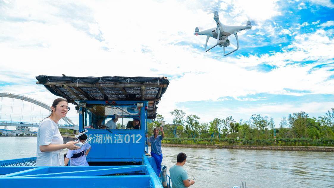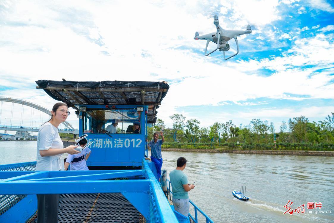 An unmanned aerial vehicle (UAV) is used to monitor the water environment of the Ditang water area in Huzhou, east China’s Zhejiang Province, July 30, 2020. (Photo by Lu Zhipeng/Guangming Picture)