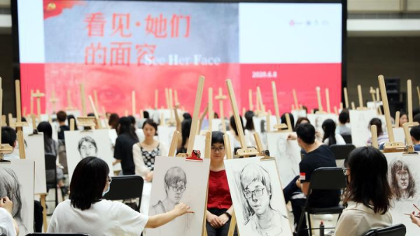 On June 8, the "See Her Face" art portrait painting activity was held in the central hall of Zhejiang Art Museum. Nearly 100 teachers and students of China Academy of Art made live portraits for 40 female medical staff who have supported Hubei from the Sir Run Run Shaw Hospital of Zhejiang University School Of Medicine, and the portraits were given to the angels. Ying Jinfei, director of Zhejiang Art Museum, said it was the first time that such a large-scale live portrait painting activity had been held by Zhejiang Art Museum since its opening.
