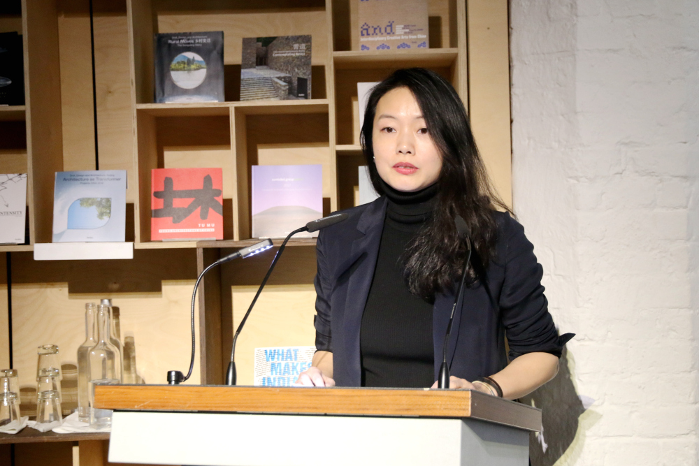 Xu Tiantian, the architect of the brown sugar factory in Songyang, speaks at a professional forum.