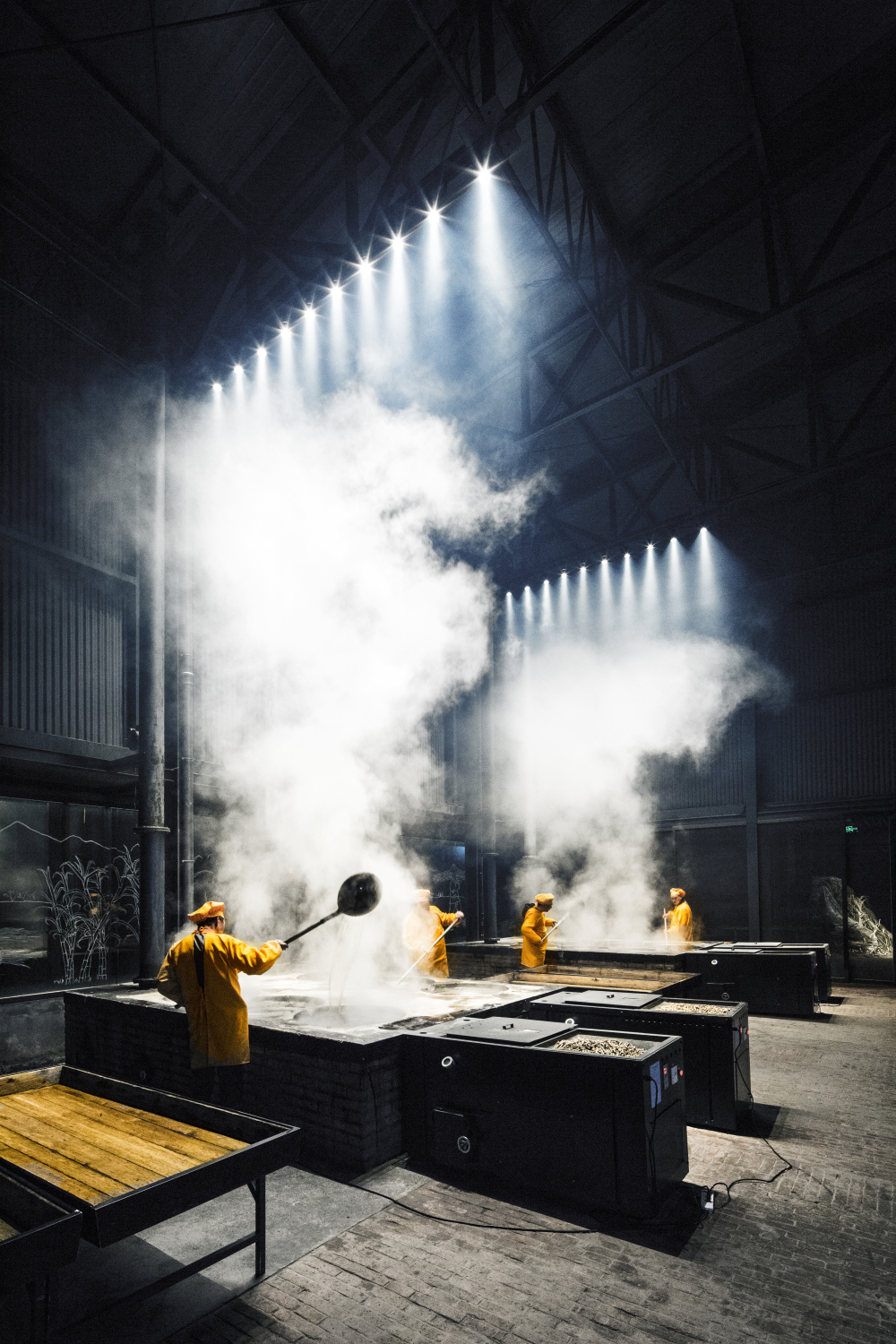 工坊里三个挑高的轻钢体分别被作为休闲体验区、甘蔗堆放区以及带有六个灶台三十六口锅的传统红糖加工区。环绕这三个区块的线性走廊,成为红糖生产剧场的环形看台和参观流线。