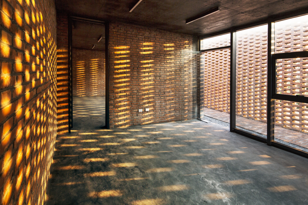 红砖、竹子……是当地常见的建筑材料,都被纳入了设计之中。纤细的竹条整齐地排列成格栅,不仅提供遮阳,也强调了“灰空间”的半室外特质。红色的砖则给人一种红糖般的温暖感受。