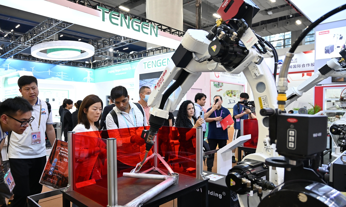 People inspect products in the industrial automation and intelligent manufacturing exhibition area at the Canton Fair in Guangzhou, South China's Guangdong Province, on April 16, 2023. Chinese exhibitors are showcasing many cutting-edge tech products despite the complex global trading environment, going all out to win orders. Photo: VCG