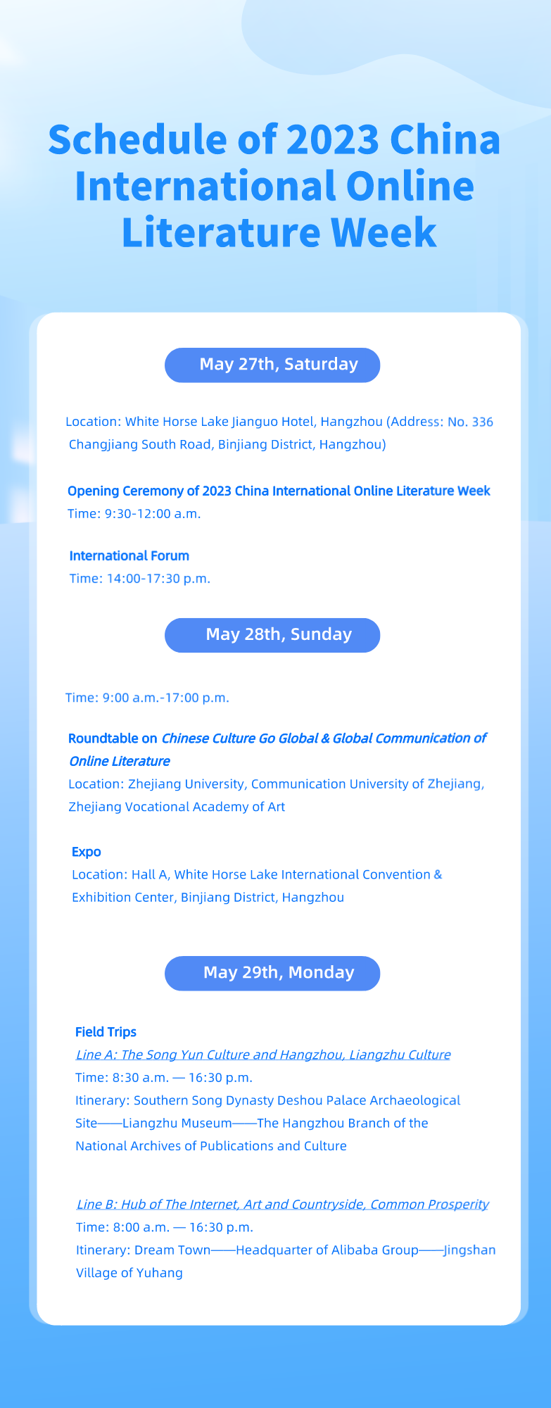 Exhibitions, expos, forums, roundtables, field trips, and other activities are scheduled from May 27th to 29th during the 2023 China International Online Literature Week.