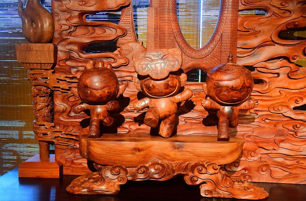 A picture taken on August 18, 2023 shows the mascots of the 19th Asian Games Chenchen, Congcong and Lianlian depicted in a wood carving in Hangzhou, Zhejiang. /CFP