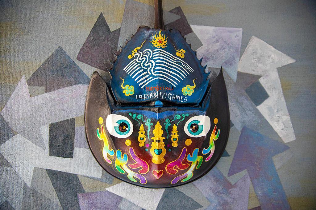 A photo taken on September 15, 2023 shows a 19th Asian Games-themed artwork created on a horseshoe crab shell in Shiqiaotouzhen in Wenling, Zhejiang. /CFP