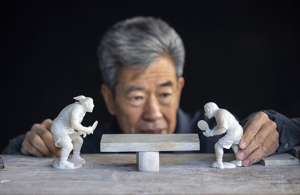 Artisan Qian Gaochao shows off his chicken-blood stone carving of a table tennis game on February 22, 2023 in Lin'an, Hangzhou. /CFP