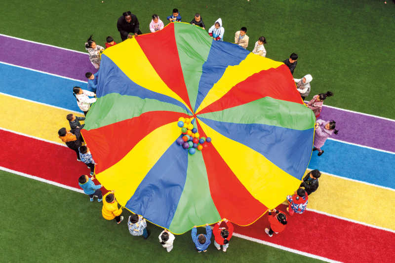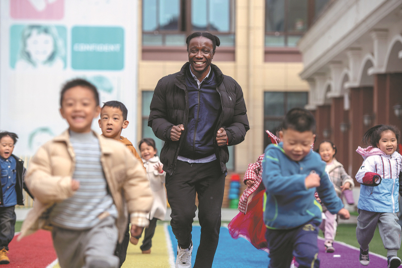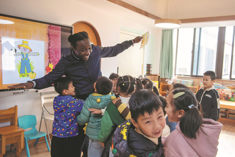 Akin E. Brown plays a game with children in the Longshan community in Changxing county, Huzhou, Zhejiang province, on Nov 16. (Photo/TAN YUNFENG/FOR CHINA DAILY)