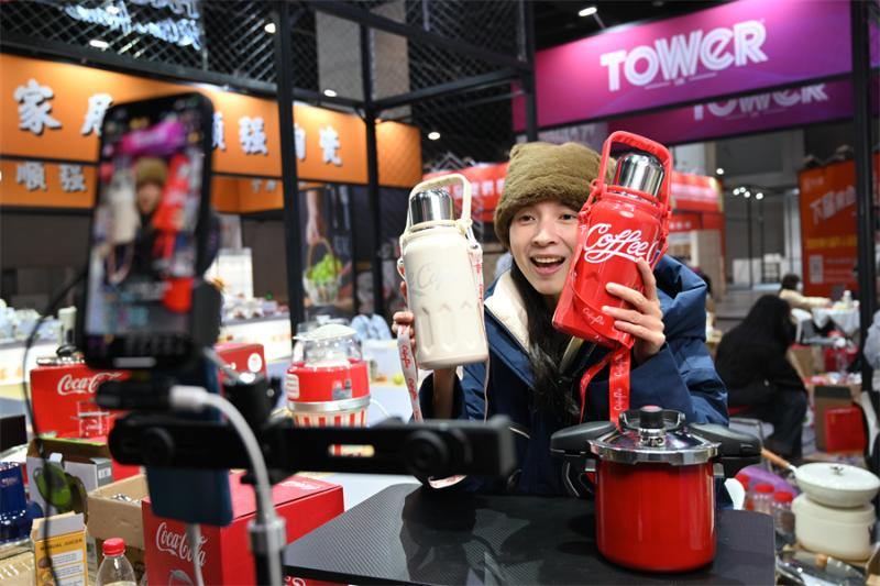A woman sells products via a live-streaming platform in Yongkang, Zhejiang province, on Dec 21, 2023. (Photo/Xinhua)