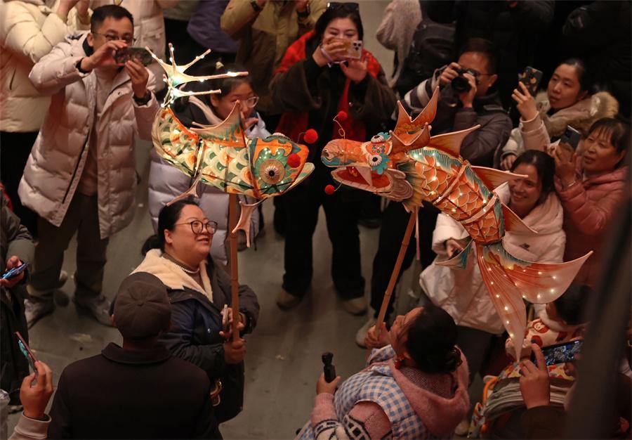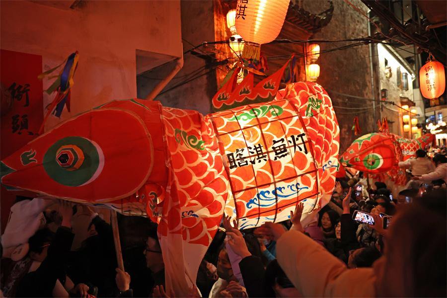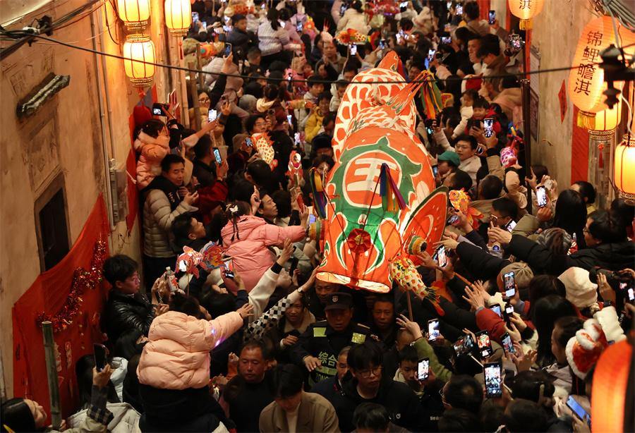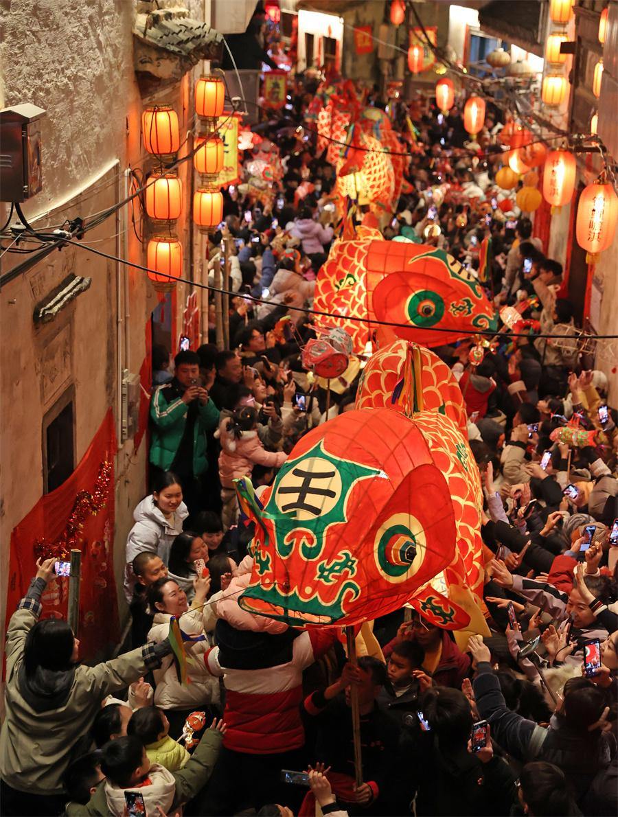 Visitors enjoy the Zhanqi fish-shaped lantern parade, an intangible cultural heritage, in Zhanqi village, Huangshan city, Anhui province on Jan 30, 2025. [Photo by Chen Zebing/China Daily]