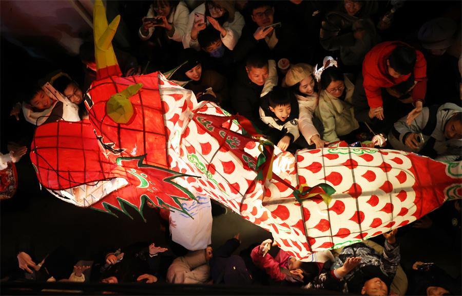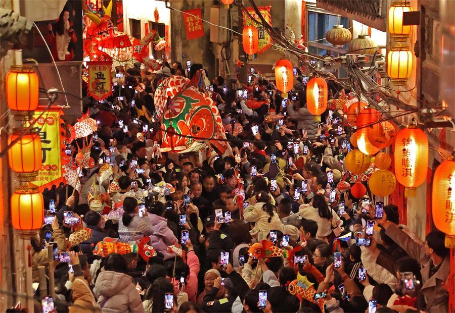 Spring Festival is being celebrated with a fish-shaped lantern parade in Zhanqi village, Huangshan city, Anhui province.