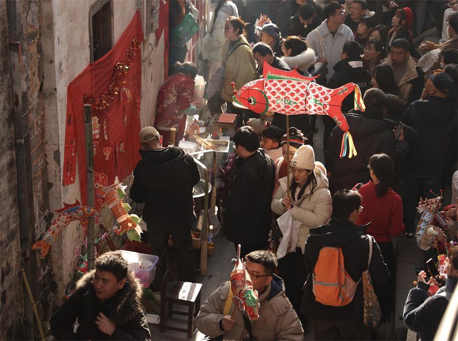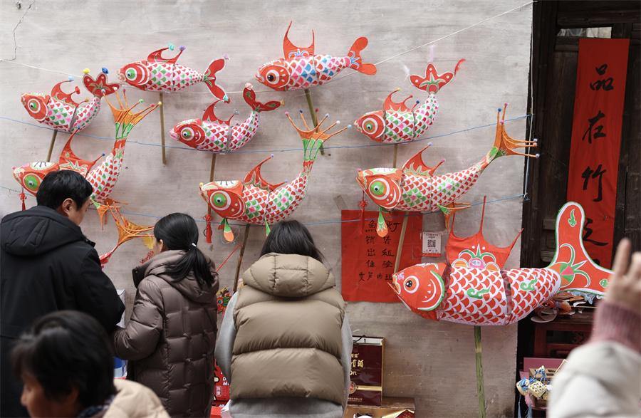 Visitors select fish-shaped lanterns in Zhanqi village, Huangshan city, Anhui province on Jan 30, 2025. [Photo by Chen Zebing/China Daily]
