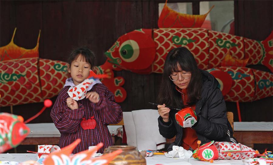Visitors experience the art of painting fish-shaped lanterns in Zhanqi village, Huangshan city, Anhui province on Jan 30, 2025. [Photo by Chen Zebing/China Daily]