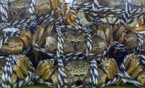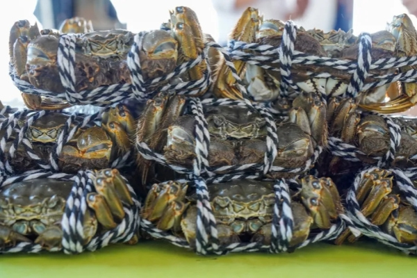 The other of the treasures is the "Yangdang" river crab from Changxing county. Cultivated in natural rivers and lakes called "Yangdang" by locals, the crab features a green shell, white belly, golden claw, and yellow fuzz. It is well-known for its large body, tender meat, and thick crab roe.