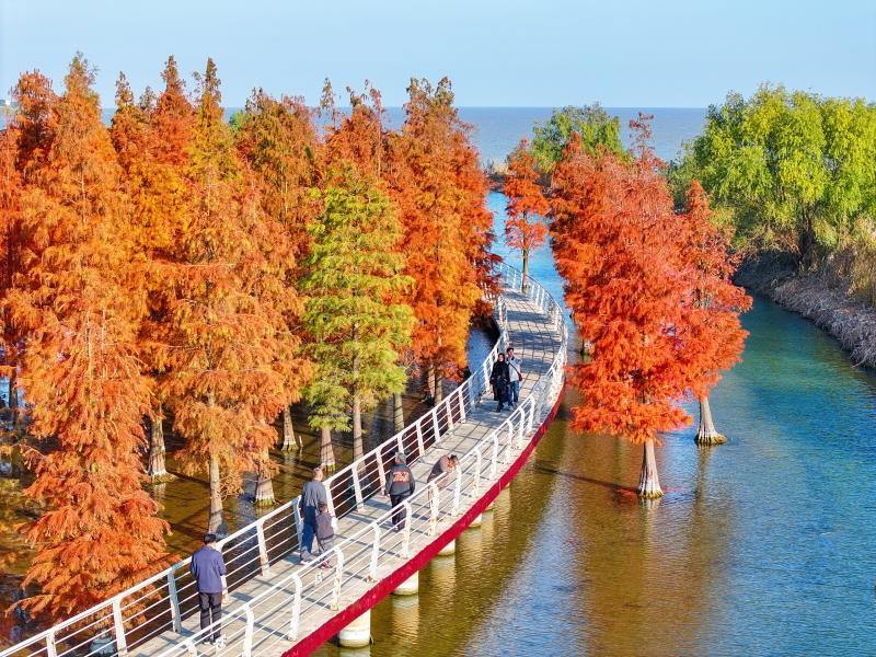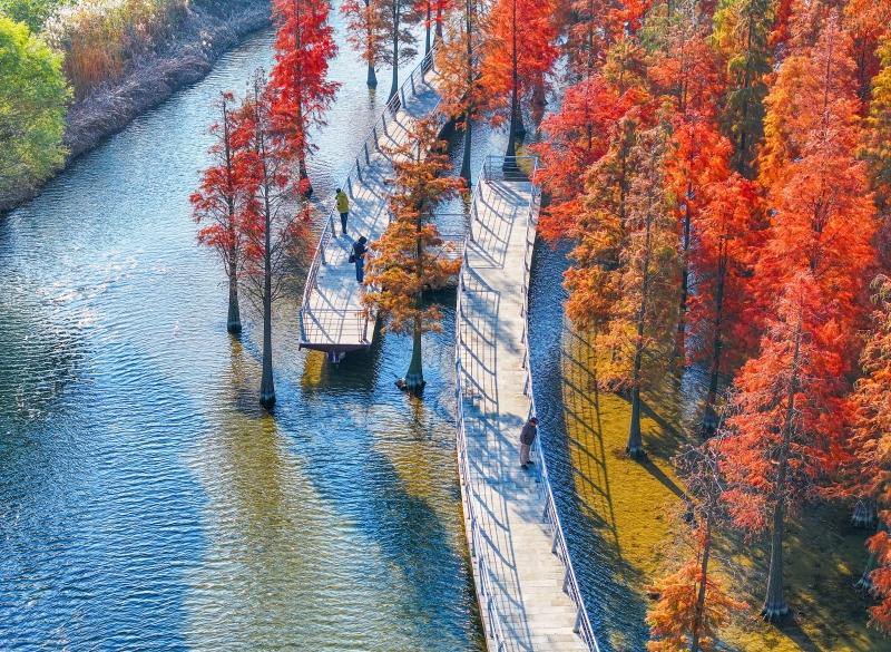 A stunning display unfolded at the Taihu Lake Viewing Platform in Changxing county, Huzhou, Zhejiang province, on Dec 8. The metasequoia trees painted the landscape in a myriad of colors, enchanting visitors who strolled through the forest, capturing the beauty with their cameras.