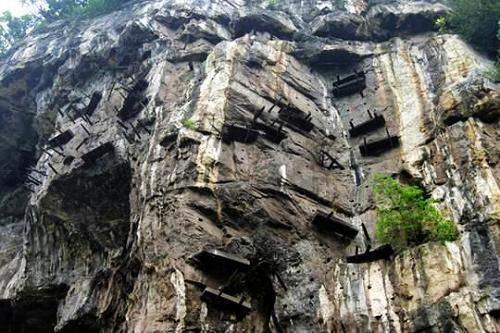 As the name indicates, a wooden coffin is suspended and inserted into the timber piles fixed on the cliffs, or put into the cliff caves or crevices, or hung outside the cliffs. The cliffs are usually steep and high, facing deep creeks below and cannot be climbed. It is a strange funeral custom observed by some ethnic minority groups in the south of China in the ancient time. Nowadays the origin of the hanging coffin funeral cannot be identified. We only know that this funeral custom has been passed on for hundreds of years to thousands of years.