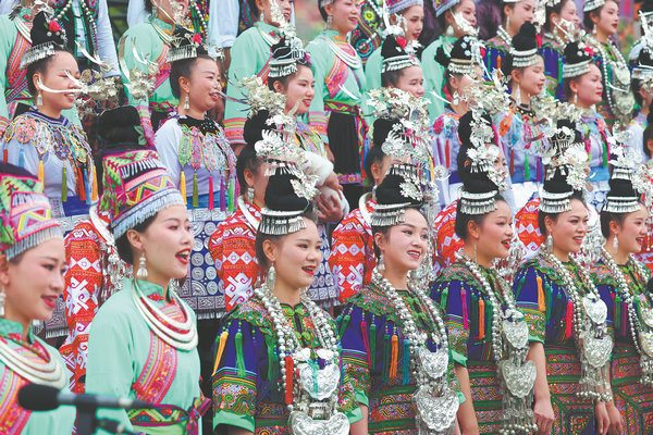 Singers wearing colorful Dong ethnic costumes entertain the crowd during the parade in Guiyang, Guizhou province. [Photo by ZHU XINGXIN and YANG JUN/China Daily]
