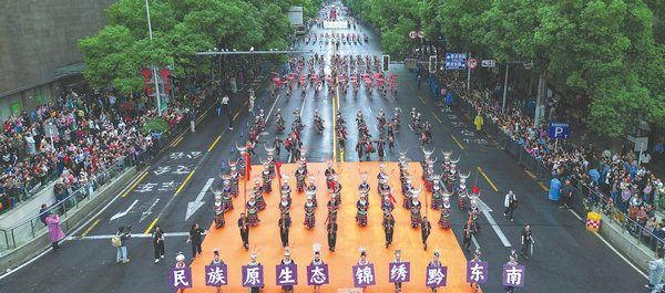 Moved by the cheerful rhythm of song and dressed in a traditional costume, Chen Chuanqian, along with many others from different ethnic groups, sang and danced in Guiyang, capital of Southwest China's Guizhou province. At 9:30 am on May 18, thousands of people from various ethnic groups from all over Guizhou gathered and paraded in Guiyang. Wearing different costumes, they assembled on a parade square, playing a traditional musical instrument known as the lusheng (reed-pipe flute), banging gongs and drums, and singing and dancing.