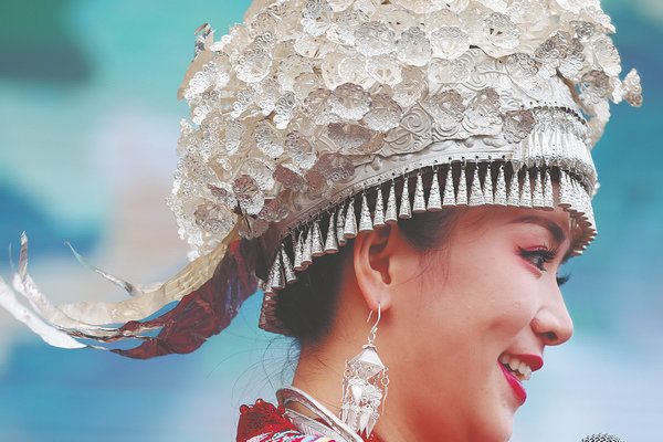 A singer wearing an elaborate headdress. [Photo by ZHU XINGXIN and YANG JUN/China Daily]