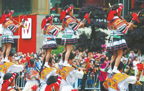Supported by other performers, children play the lusheng, a reed-pipe flute. [Photo by ZHU XINGXIN and YANG JUN/China Daily]
