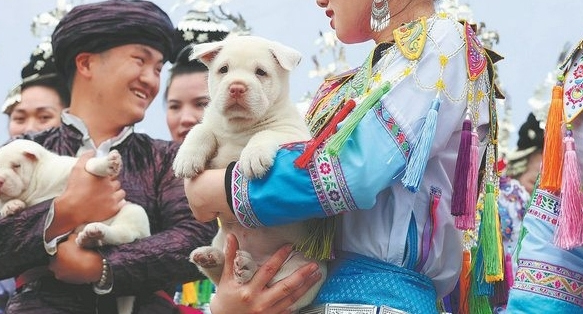 With dogs in their arms, the Dong people enjoy the carnival. [Photo by ZHU XINGXIN and YANG JUN/China Daily]