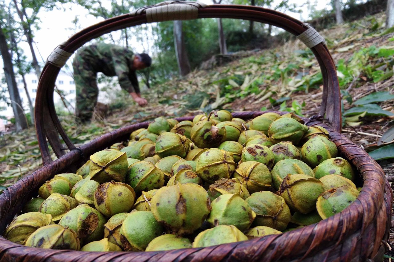 Chinese hickory trees grow in the deep mountainous area of Tianmu Mountain. It takes 10 years for a hickory tree to grow into maturity and its height can reach up to 20 meters. The hickory tree only bears fruit when it is mature and the fruits grow at the top. Workers risk their lives climbing the trees in order to collect the fruit.
