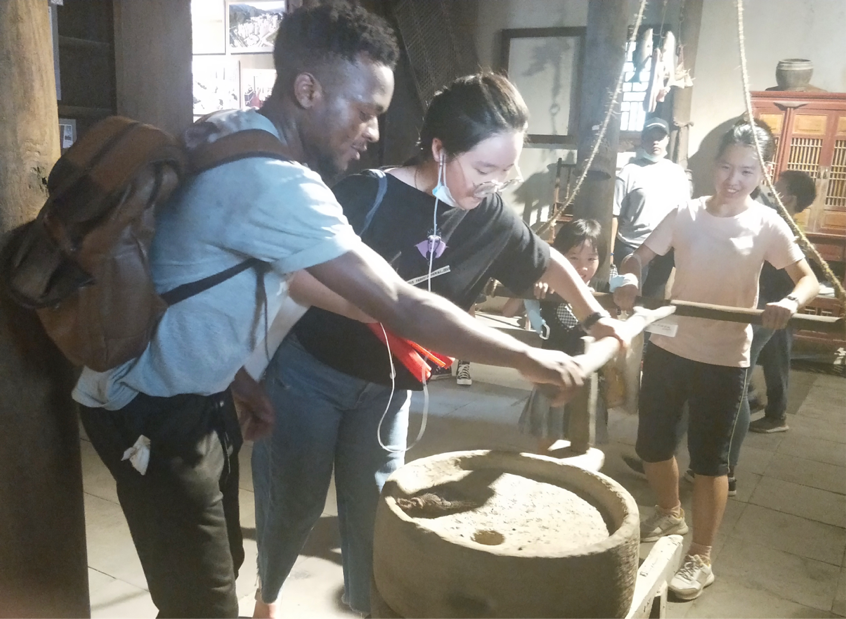 A huge stone mill was placed in one hall, arousing the curiosity of both some Chinese teenagers and international students. With the assistance of the volunteers, some internationals made attempts to move it.
