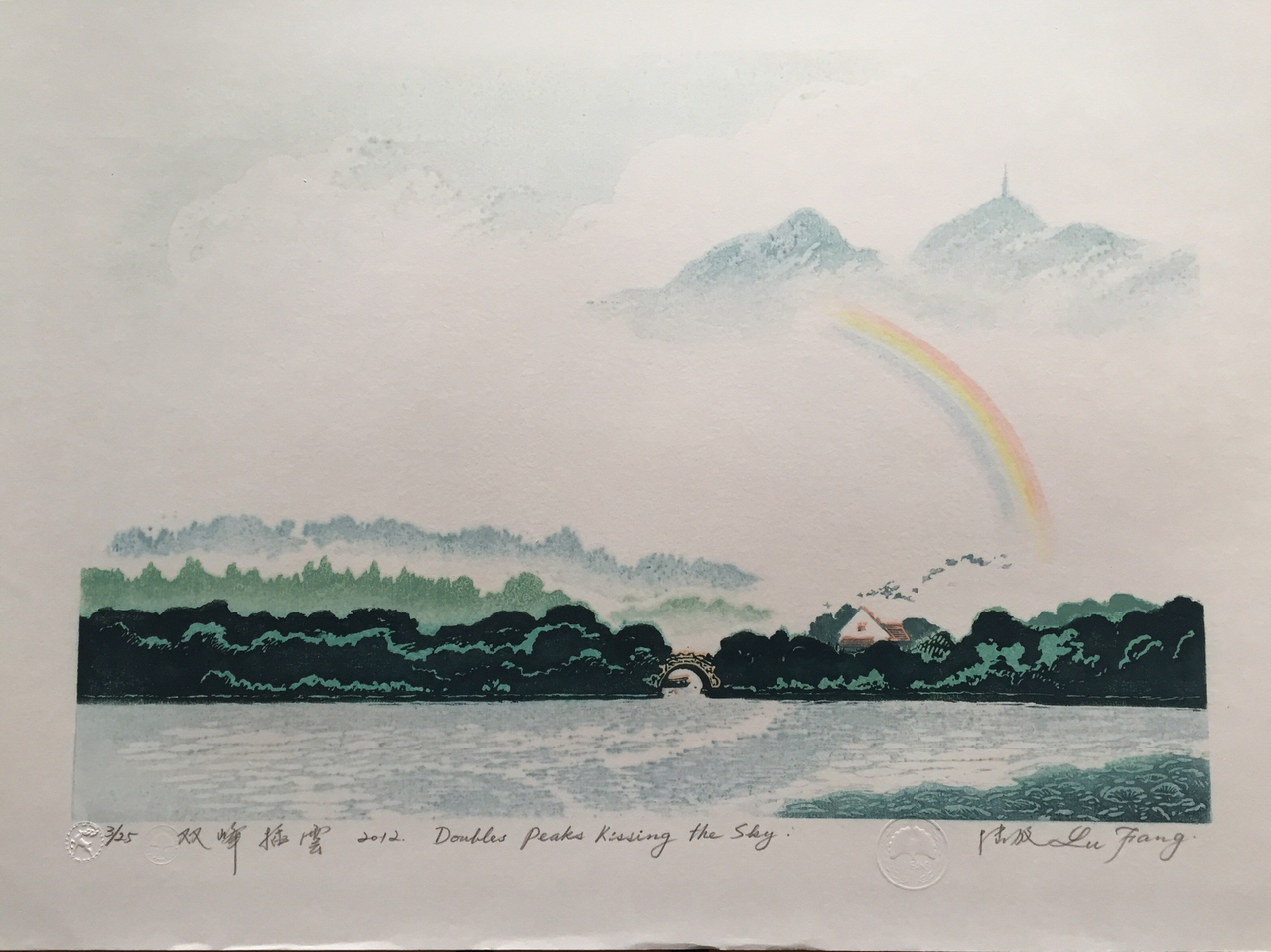 What makes Lu Fang’s West lake series special is more than the poetic beauty of the lake. Lu Fang makes use of a woodblock printing technique originally used at a woodblock printing studio in Nanjing in the 17th century. He has improved the technique by retaining the original touches achieved through the carving tools and the wood and by adding colors to the print. He creates a special ink-wash effect in colors on rice paper, which is widely used for painting landscape in the traditional Chinese style.