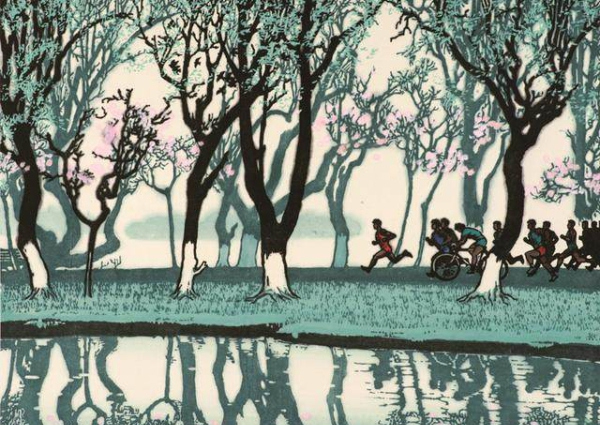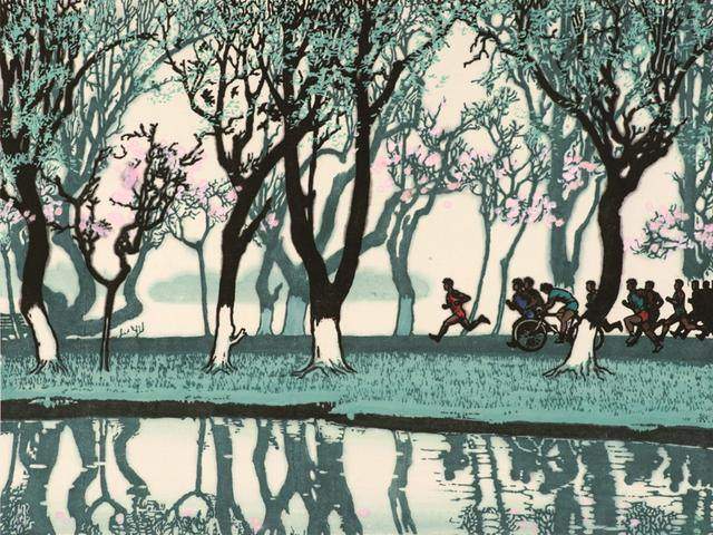 1973年,陆放创作了水印木刻版画《苏堤春晓》。画面上,那春意盎然的苏堤,那激情奔跑的青年,似乎让人闻到春天的味道和青春的气息。