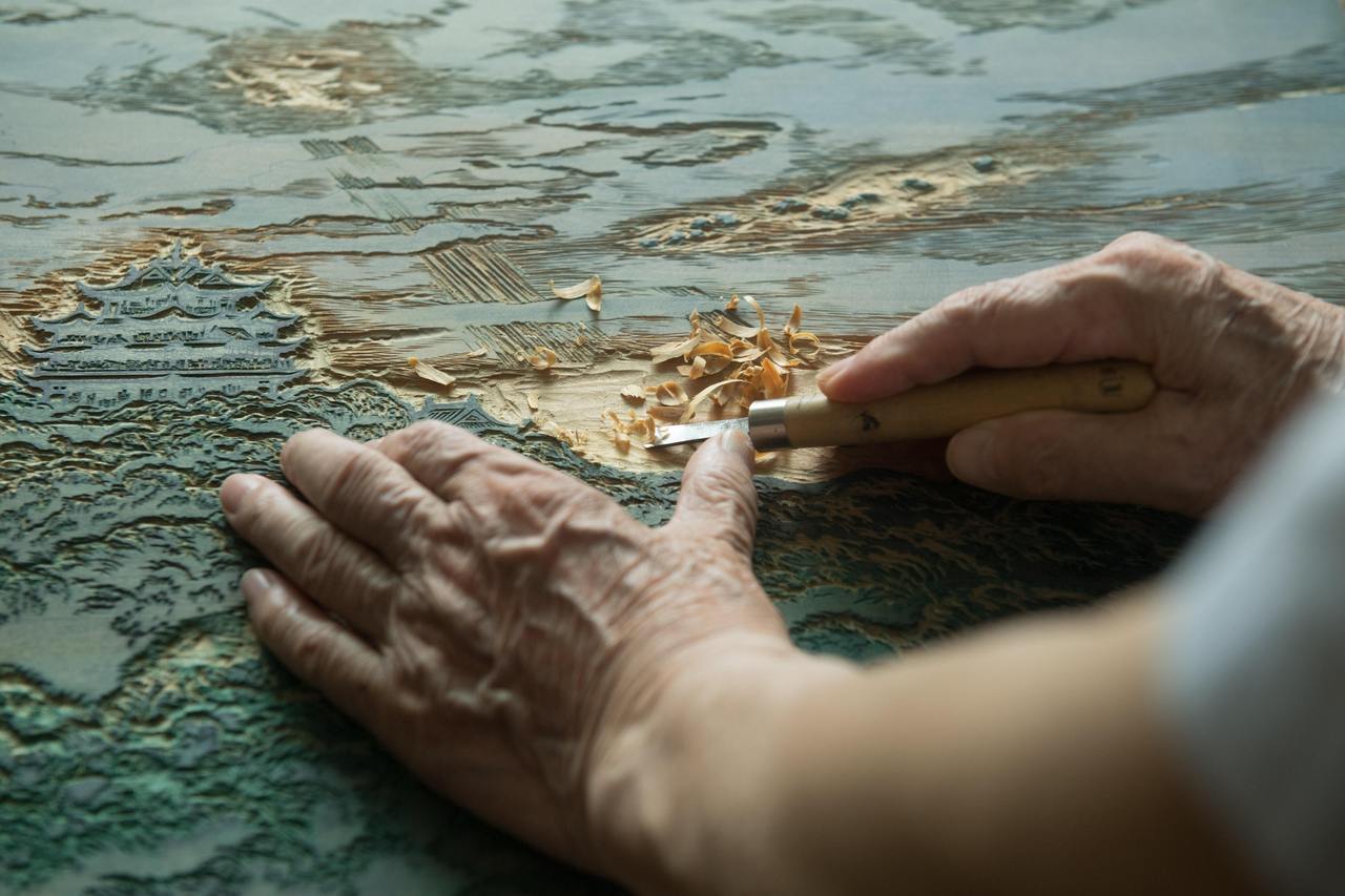 In 2000, a restoration project was launched to bring back the City God Pavilion on the Wu Hill by the West Lake. Lu began to think of creating a woodprint about the scenic landmark. Accompanied by a restoration project supervisor, he climbed up the scaffolding and got into the pavilion to take a look over the lake. Then he began to create a woodcut. In 2002, he finished the carving and stopped just before he was to make it into a print, for he wasn’t sure about the colors he was to use. He shelved the woodcut until 2018 when he finally figured out what to do.