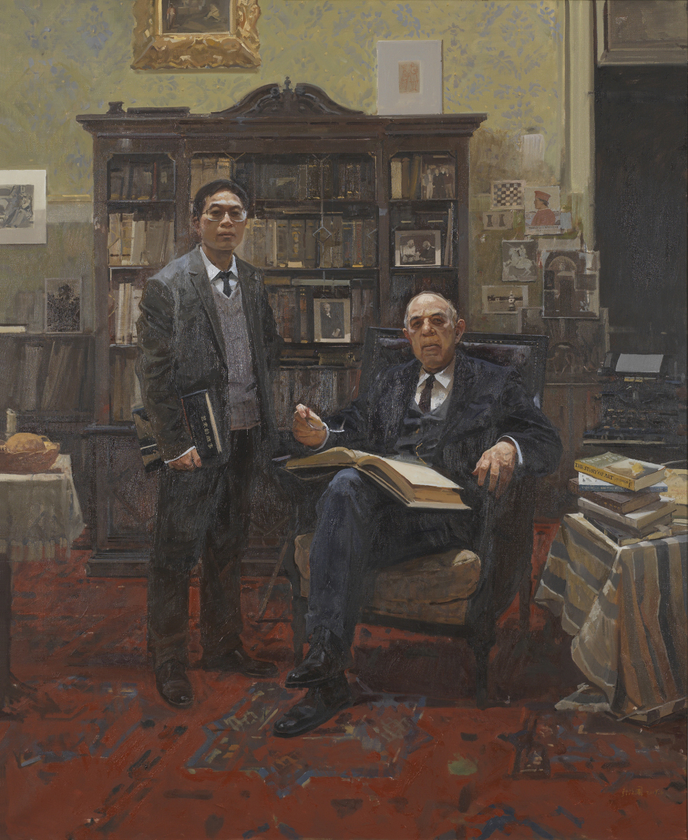 The painting highlighting Fan Jingzhong and Ernest Gombrich is an artwork by Feng Zhiguo. The artist points out that his work salutes great intellectuals of the past generation. The painting is not just about a story of art. It is also a story about a whole generation of scholars and intellectuals.