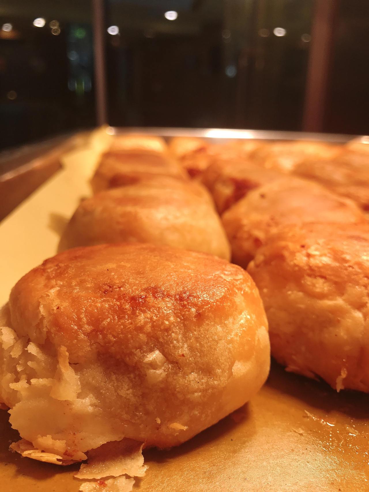 还有就是笔者小时候吃得最多的老大房。他们家卖的九芝斋鲜肉榨菜月饼,每只售价3元。一进门,隔老远就能闻到香味,拿到手还是烫乎乎的。掰开月饼,榨菜和肉粒分明,美中不足的是外面的月饼酥皮层次不够分明,咬下去有点实,虽然肉馅也不少,但入口总觉得“皮厚肉少”。