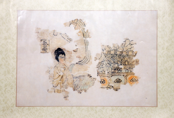 Silkworm Lady was discovered in 1994 when experts of Wenzhou Museum were sorting out a batch of books and prints, in seriously damaged conditions, discovered in the stone pagoda from Guo’an Temple. The pagoda stands on the top of Five-Peak Mountain in Longwan District of Wenzhou. In 1987, a restoration project, funded by the provincial administration of cultural heritage, was launched. A stone stele, discovered in the restoration, indicates the pagoda was built from 1090 to 1093, which were the years of the Northern Song. The chromatic woodprint was discovered in a square stone alcove on the third floor of the pagoda. A stone stele in the alcove is dated 1091. It is therefore assumed that the woodprint was produced no later than 1093 when the pagoda was done with construction.