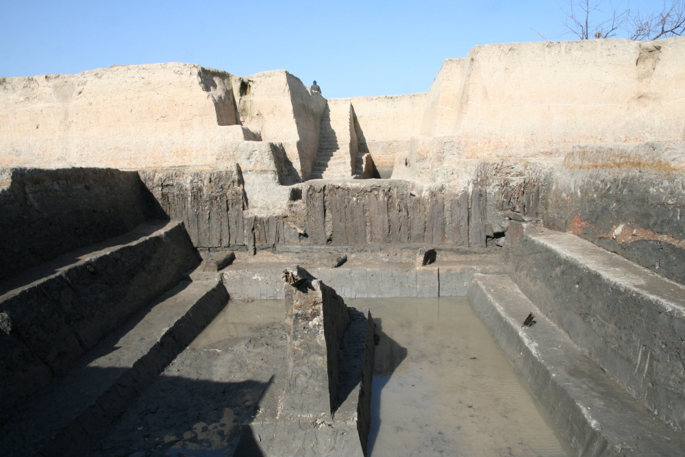 Plank revetment was built for an artificial vertical bank. Among pottery shards unearthed from the riverway, many black pottery shards are engraved with exquisite patterns.