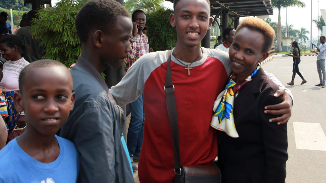 Mike Manzi (C), a Rwandan student, bids farewell to his family and friends before departing for China to attend an undergraduate program at the Alibaba Business School at Kigali International Airport in Kigali, Rwanda, on Sept. 9, 2019. Twenty-two Rwandan students will spend four years in the Chinese city of Hangzhou, studying subjects including the Internet, international trade and cross-border e-commerce. (Xinhua/Lyu Tianran)