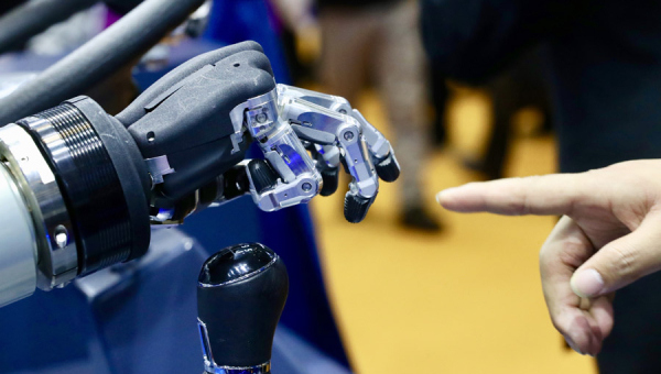 A visitor touches an automated hand at an exhibition during the second CIIE in Shanghai on Nov 6, 2019. (Photo by Zhu Xingxin/chinadaily.com.cn)