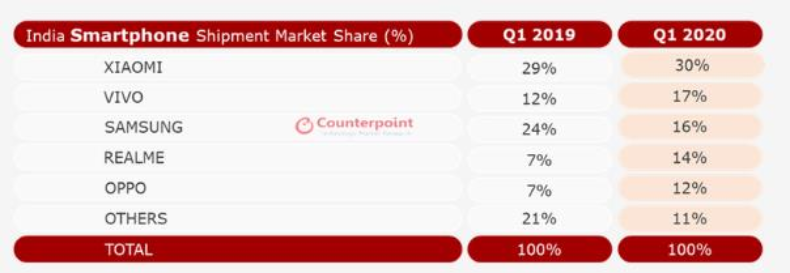OPPO has emerged as India’s favorite innovative handset brand in the premium segment. OPPO constantly focuses on camera capabilities and long-lasting and fast-charging batteries, which have impressed young customers the most. OPPO has a similar offline marketing strategy to Vivo. People can see OPPO and Vivo selling everywhere in India. The budget friendly OPPO A5 series, A31, and A9 2020 have shown especially good performance.