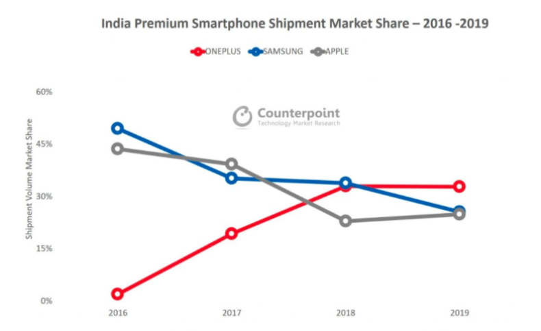 Chinese phone brand OnePlus has become the new leader of India’s premium smartphone segment (≥ Rs. 30,000 retail price), followed by Samsung and Apple in 2019. In 2019, its shipments grew 28% YoY and captured one-third of India’s premium segment.