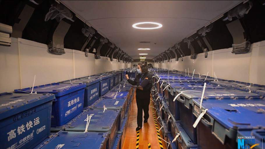 The staff counts the cargo in the carriage high-speed rail freight train. (Photo/Xinhua)