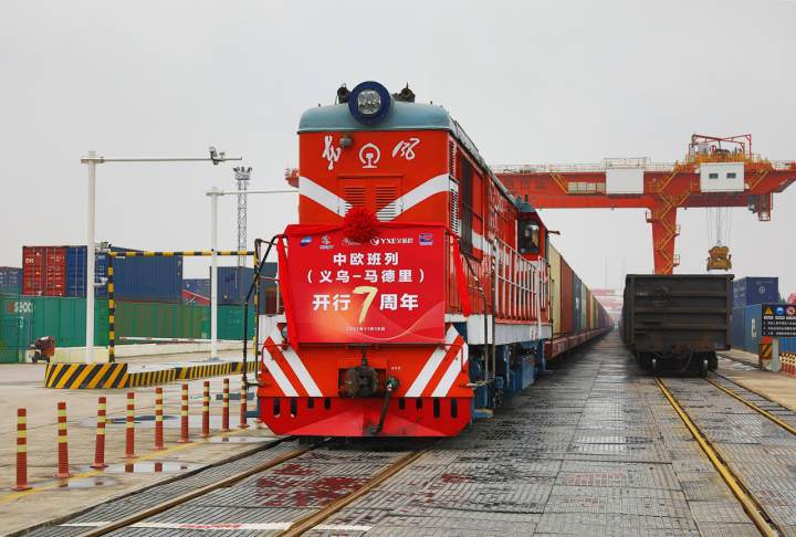 On November 18, 2021, the X8020 "Yixinou" China-Europe freight train, loaded with Yiwu small commodities, set off from Yiwu West Railway Station and headed for Madrid, Spain, which is 13,052km away. On the same day, the Yiwu-Xinjiang-Europe Freight train marked its seventh anniversary. (Photoed by Gong Xianming)